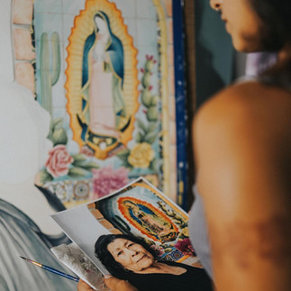 From a young age, I was captivated by the vibrant colors, and symbolic imagery found in Mexican art, folklore, hand painted tiles, intricate patterns, and the iconography of the Catholic Church. These visual elements have become integral to my artistic expression, serving as a source of inspiration and a means of connecting with my roots. Whether I'm painting portraits of my family members, symbols from Mexican folklore, or exploring themes of immigration, my Mexican heritage continues to serve as an endless source of inspiration and motivation.
