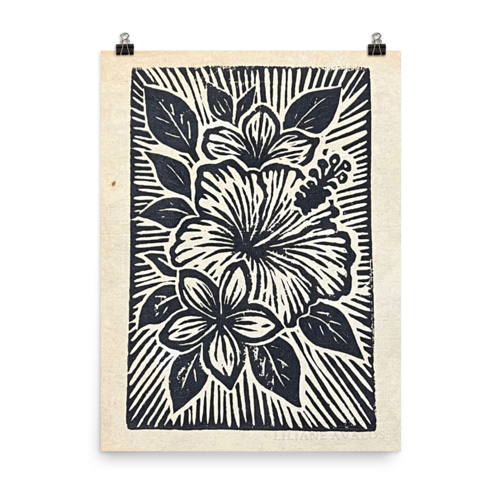 Inspired by Liliane Avalos’ original hand-carved linocut design, this piece captures the love of the Garden Isle, the way the hibiscus and plumeria blossoms catch the morning light, glowing softly beneath the island sun.